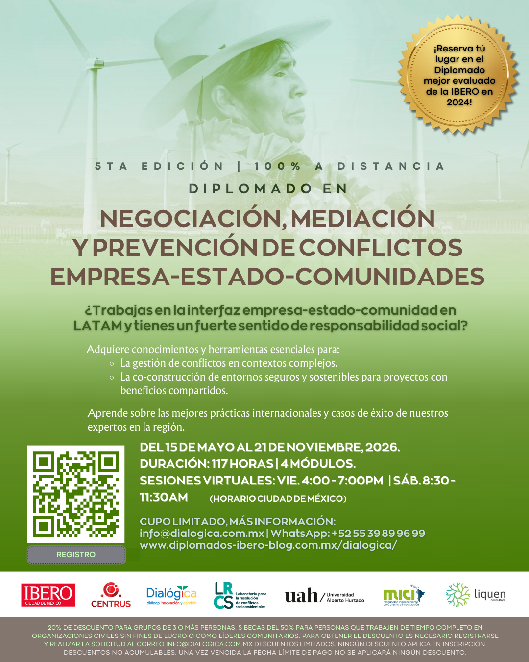 Para obtener el descuento es necesario registrarse y realizar la solicitud al correo info@dialogica.com.mx. Descuentos limitados. Ningún descuento aplica en inscripción. Descuentos no acumulables. Una vez vencida la fecha límite de pago no se aplicará ningún descuento. Vacaciones de verano: 25, 26 de julio y 01, 02 de agosto 2025 / Feriados: 12 y 13 de septiembre 2025. La Universidad Iberoamericana Ciudad de México se reserva el derecho de posponer, modificar o cancelar sus programas.