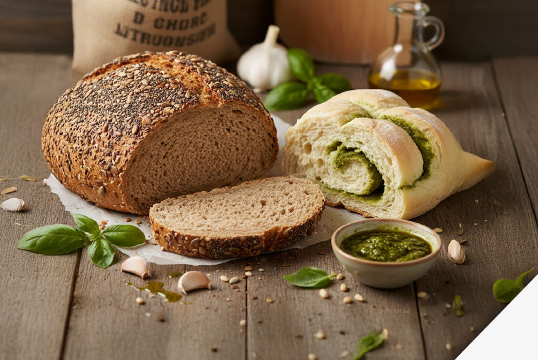 Panadería artesanal: pan integral con semillas y pan blanco con pesto casero