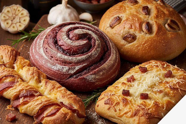 Panes saborizados: vino tinto, ajo confitado, tocino y queso